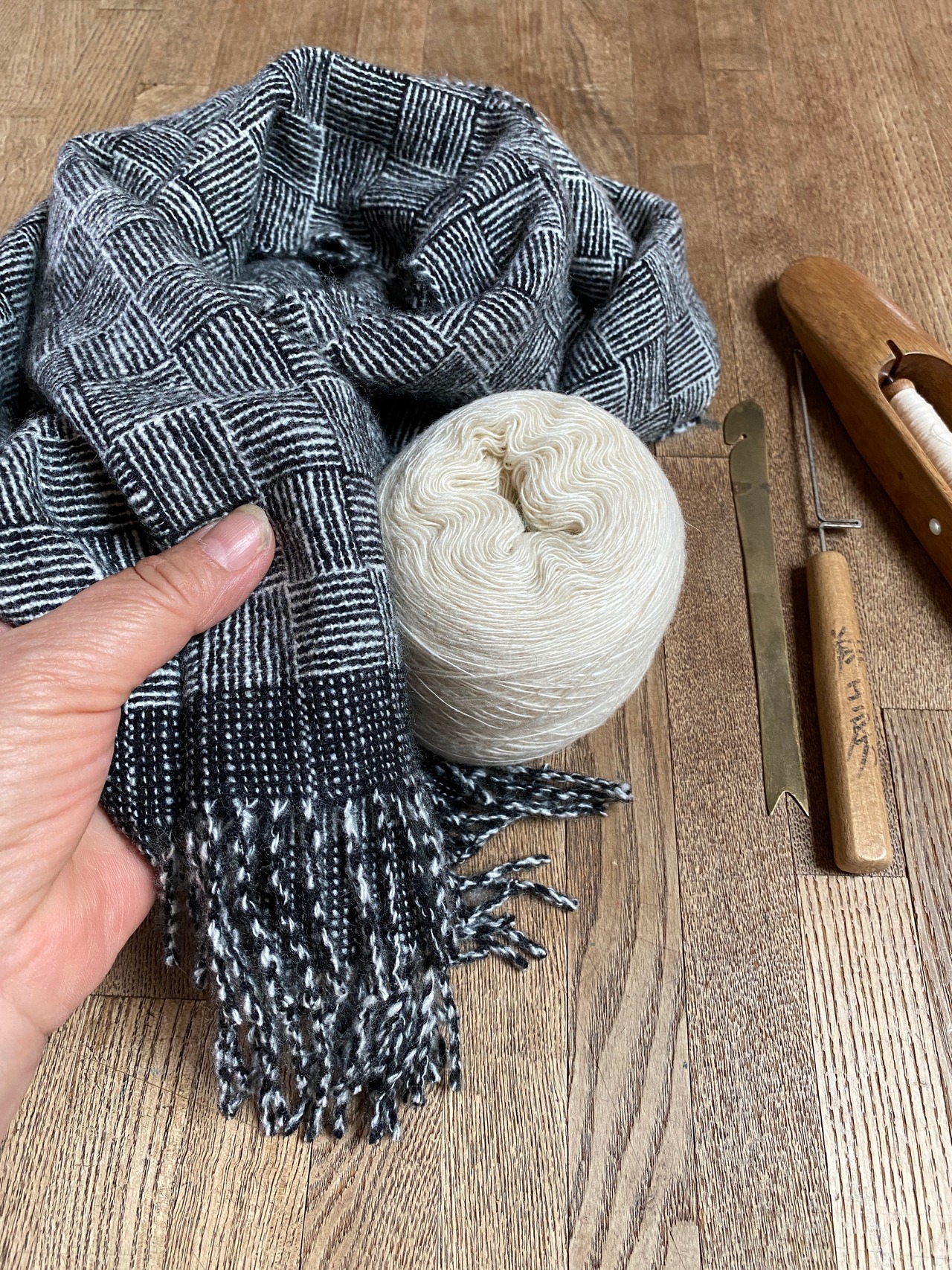 そんなカシミヤの整毛(白)を手紡ぎした糸と紡績糸の黒糸で伝統の柄、網代模様を手織りをしています。黒の中に白い手紡ぎ糸の不揃いな表情に手仕事の温かさを感じていただければ嬉しいです。